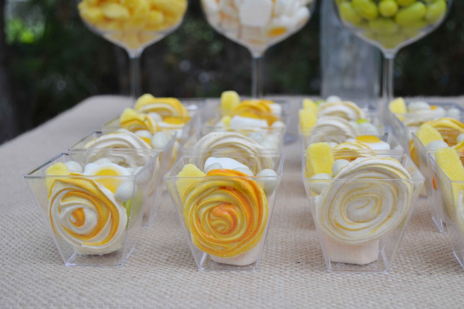 5- Roses de merenga de llimona: les vaig fer una setmana abans ja que necessiten molt de temps dins el forn i no hagués tengut temps de fer tot el demés. A més, aguanten perfectament setmanes ben tapades. Les vaig posar dins uns tassonets de plàstic amb llepolies dels tons de la festa.