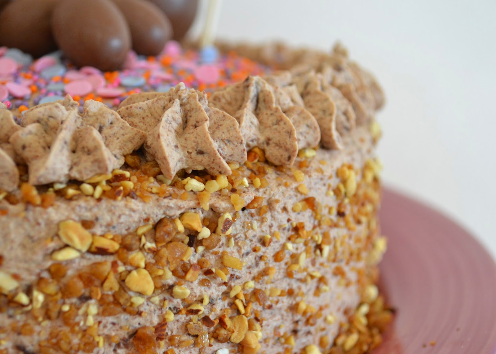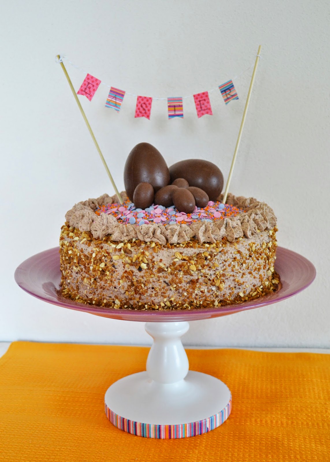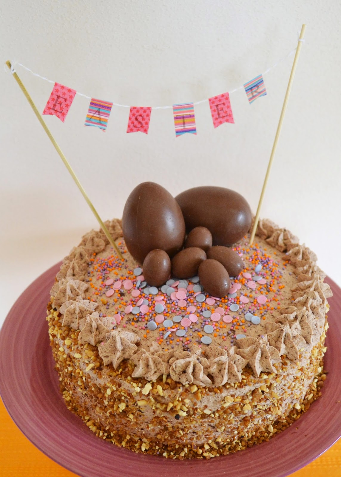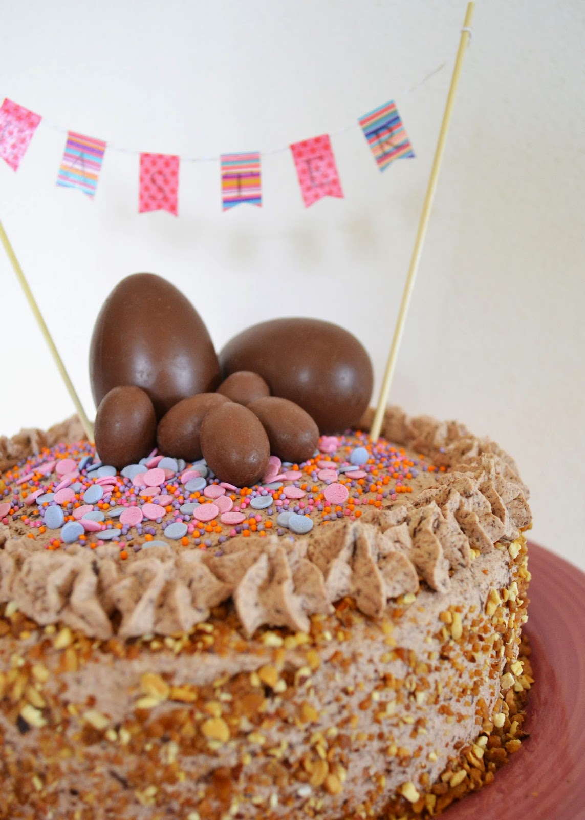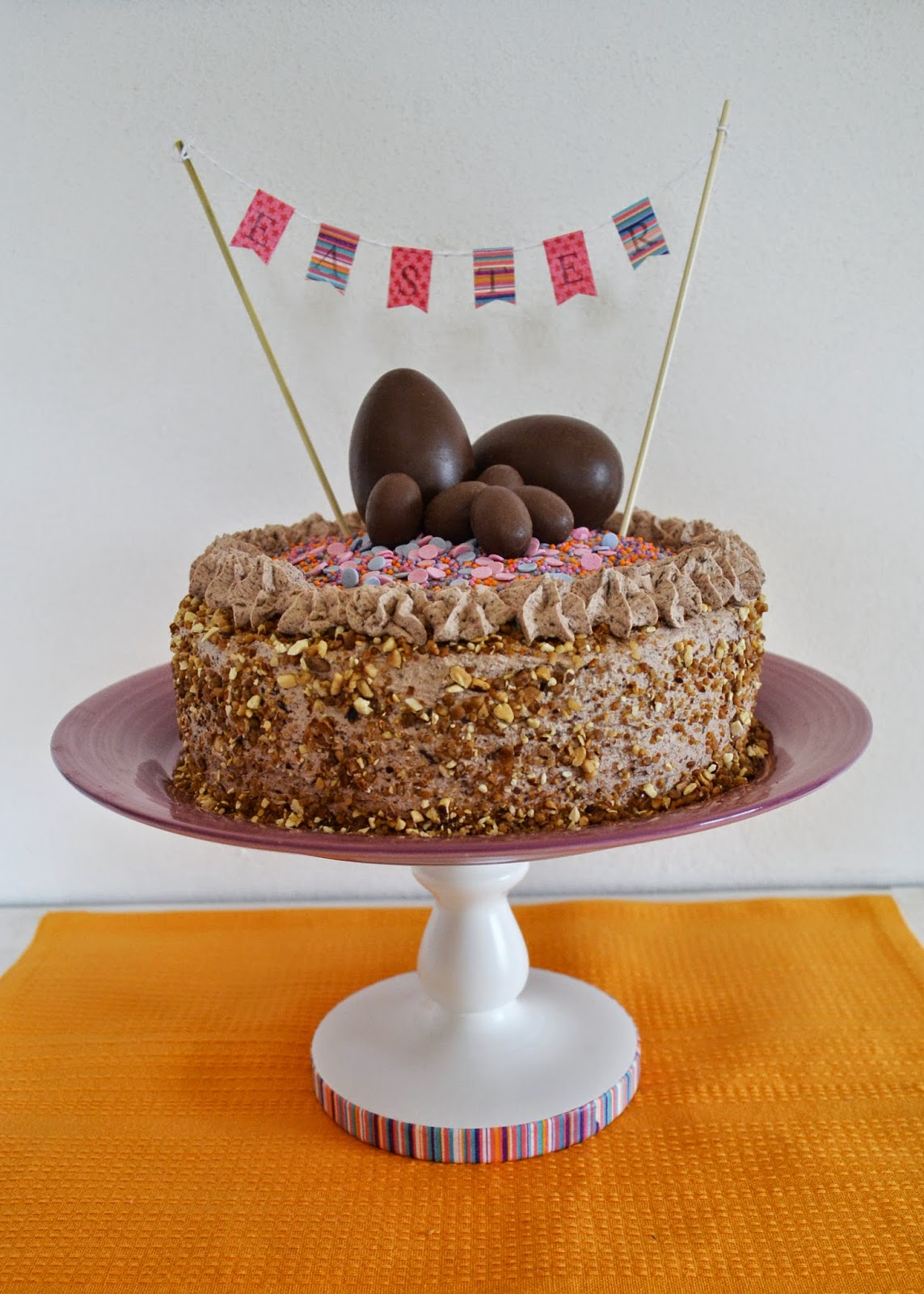 1- Primer de tot mesclau el sucre amb l’oli. En estar ben mesclat, afegiu els ous un a un, han de quedar ben incorporats.2- Anau afegint la farina i el llevat en pols en tres o quatre vegades. Així vos assegurareu de no deixar grumolls i afegireu més aire a la pasta..3- Quedarà una pasta un poc espessa, per tant, ara és el moment d’afegir la llet. Mesclau-ho bé tot.4- Untau bé el motlle on l’enfornareu i vessau-hi la pasta.Forn a 160º, uns 20-25 minuts o fins que en punxar amb un escuradents, aquest surti net. Jo només l’he tengut aquest temps perquè he separat la pasta en tres motlles iguals, ja que així després és més bo de fer pels pisos. Si ho feis tot en un sol motlle segurament estarà més temps.Pel muntatge:1- Tallau la coca en tres capes.2- Posau el primer pis de coca sobre el plat en què el muntareu. Posau una capa generosa de trufa per farcir, o el farcit que més vos agradi. Tapau amb la segona capa de coca.3- A sobre d’aquesta segona capa posau una capa de confitura (jo l’he posada de gerds perquè era la que tenia per casa). Tapau amb la tercera capa de coca.4- Amb la trufa que vos ha sobrat, tapau tot el pastís, pels costats i per sobre. Una vegada tot tapat, jo he posat ametlla torrada en trossets (“crocant”).5- I per sobre de la tarta podeu posar el que trobeu o se vos acudeixi. En aquest cas he fet una banderola amb pals de broqueta, fil i washi tape. També he fet un poc de decoració amb la màniga pastissera amb la trufa que ha sobrat. I per acabar, ous de xocolata i perletes de sucre de colors! Et voilà!Ara que s’acosten les vacances de Pasqua aprofitau per fer alguna recepta diferent, i ensenyau-me-la!!!Bon profit!!!PD: no estic molt convençuda de la trufa que he fet, per tant esperaré a trobar una recepta que m’agradi més per posar-la. -