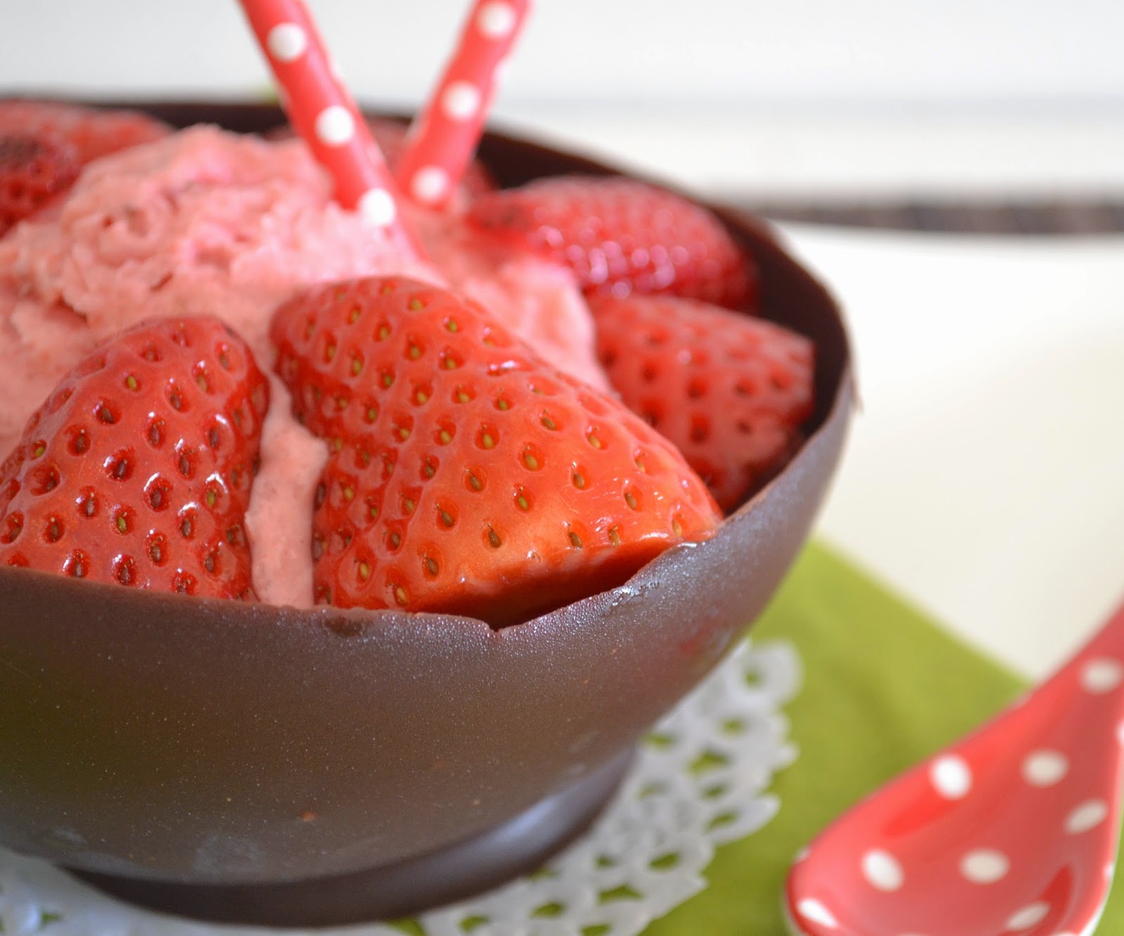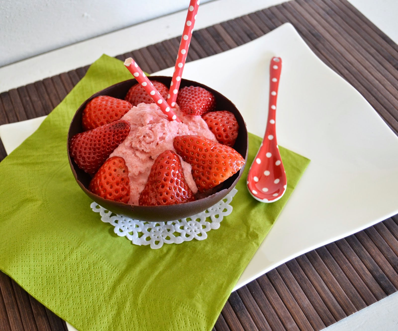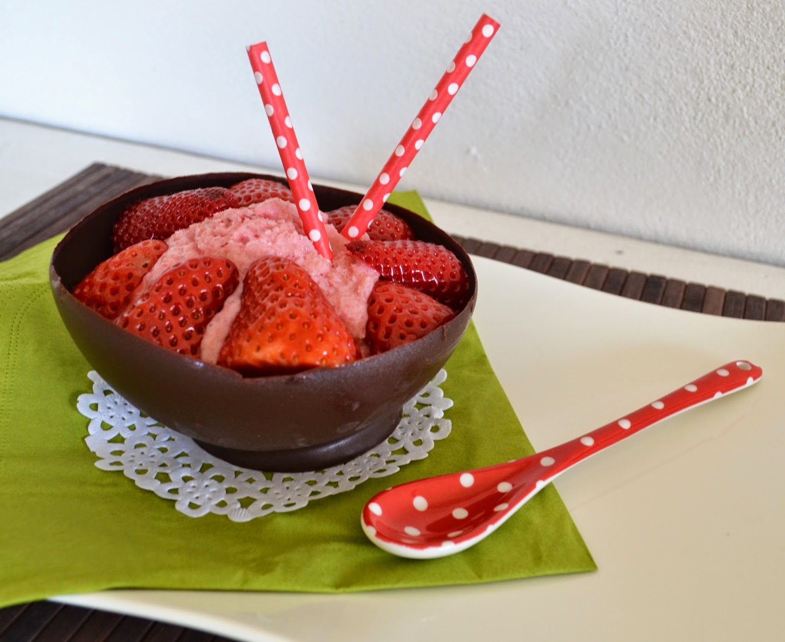 Des de fa més de deu anys som membre de l’Associació d’Amics del Museu d’Història de Manacor, gran part dels quals en som la secretària. Ens dedicam sobretot a promoure la història de la nostre ciutat amb les peces que tenim en el museu, ubicat dins una torre medieval a la sortida de Manacor. A més també programam excursions, viatges i a l’estiu, el cicle de les muses (activitats de dansa, teatre, música i fins i tot, astronomia).Doncs bé, els membres de la junta de l’Associació, a més de compartir l’interès per la cultura i la història, som amics. De tant en quant ens reunim per programar les diferents activitats. Habitualment però, les reunions en converteixen en sopar-reunió, dinar-reunió i també hem fet berenars-reunió. Res, que a vegades la reunió és més per veure’ns i menjar que per cap assumpte urgent.Avui, ha estat un d’aquests dies (això sí, avui hem decidit mooooltes coses, vos mantindré informats), dinar-reunió. I jo em vaig comprometre a dur les postres. I em vaig ficar dins un bon embull. Per què? Perquè dins un grup tan petit com el nostre hi ha diverses intoleràncies: a la lactosa, al gluten… tanta sort que no hi ha ningú diabètic, ja hagués estat un poc més complicada la cosa. Això sí, en tenim uns quants que són al·lèrgics al “plat buit”, tanta sort!El cas és que crec que me vaig passar dues setmanes pensat què podia dur i que en pogués menjar tothom. Al final vaig arribar a això. Preparau-vos!Ingredients pel bol:– Xocolata de cobertura– GlobusIngredients per la crema de iogurt:– 750 gr de maduixes– 8 iogurts naturals sense lactosa– xarop d’atzavaraPel bol:1- Inflau els globus i rentau-los bé.2- Foneu la xocolata en el microones o a bany Maria, així com vos vagi millor.3- Mesclau bé la xocolata i assegurau-vos que no queda res sense fondre.4- Agafau un globus i posau-lo dins del bol on heu fos la xocolata. Només la base. Treieu-lo i posau-lo a assecar sobre un paper de forn (així serà més fàcil desferrar-ho).5- Un cop estigui ben sec, punxau amb una agulla el globus. Perquè no es desinfli massa aviat i rompeu el bol, punxau el globus a la part superior, allà on hi heu fet el nus.Per fer la crema de iogurt: