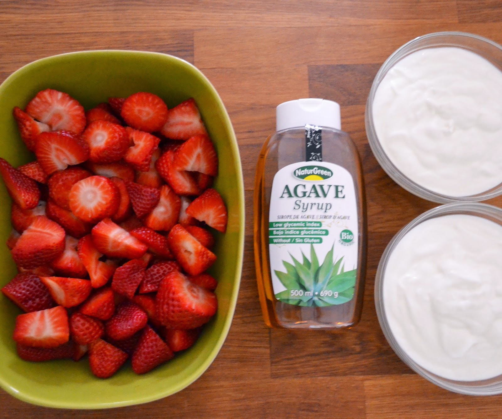 2- Com que els iogurts eren ensucrats, no hi he afegit cap edulcorant, però sí que l’he posat a la taula per si algú ho volia més dolç. En aquest cas he posat xarop d’atzavara.