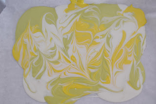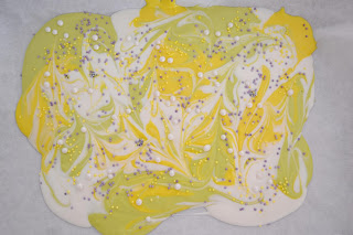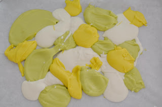 – Necessitareu xocolata de colors (jo he fet servir les de la marca Prager pel blanc i el groc i de Candy Melts pel verd clar) i perletes de colors que donin joc amb els colors de la xocolata.