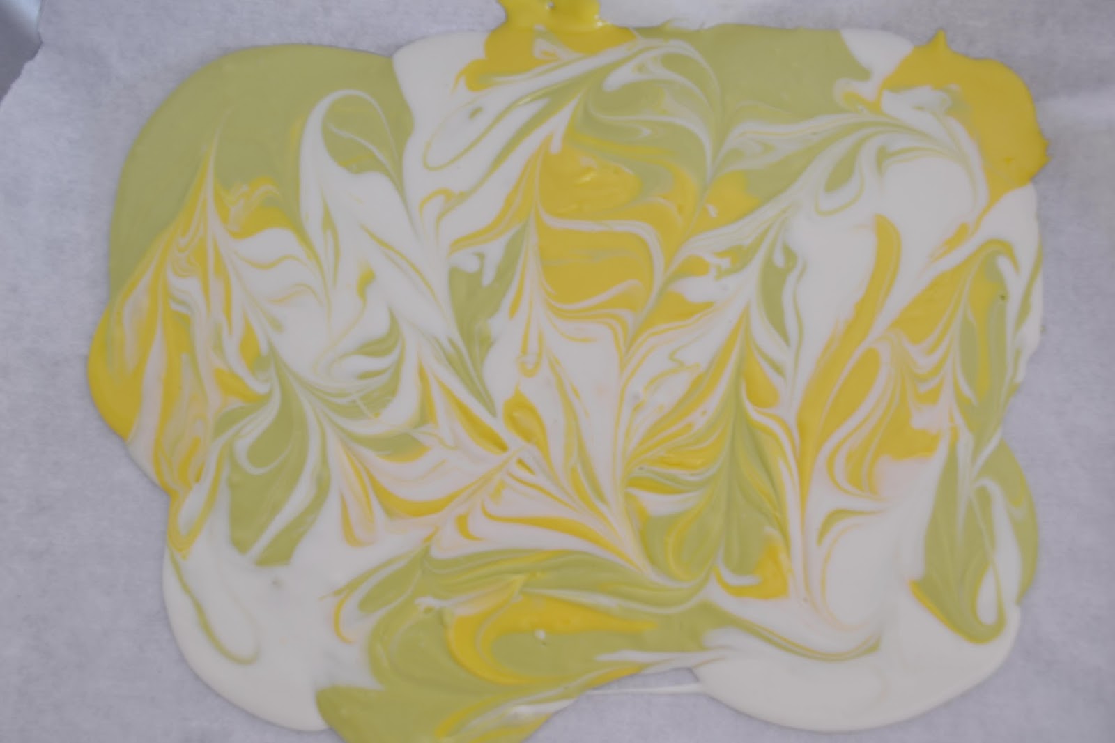 Pegau uns quants copets suaus amb la safata perquè la xocolata s’assenti bé. Quan estigui ben plana, amb un escuradents anau fent les formes que volgueu, mesclant els diferents colors.