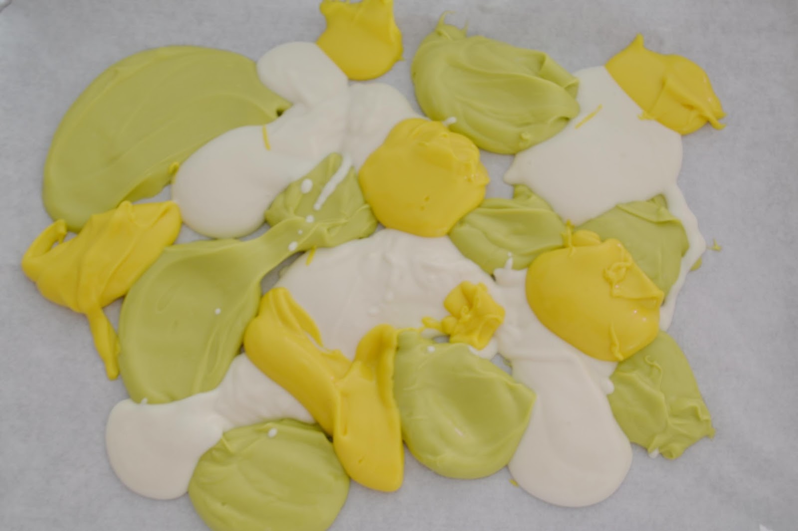 Foneu les xocolates a bany Maria o en el microones (les de la marca Prager es poden fondre directament en el pot) i posau cullerades de diferents colors sobre un paper de forn que tendreu sobre una safata.
