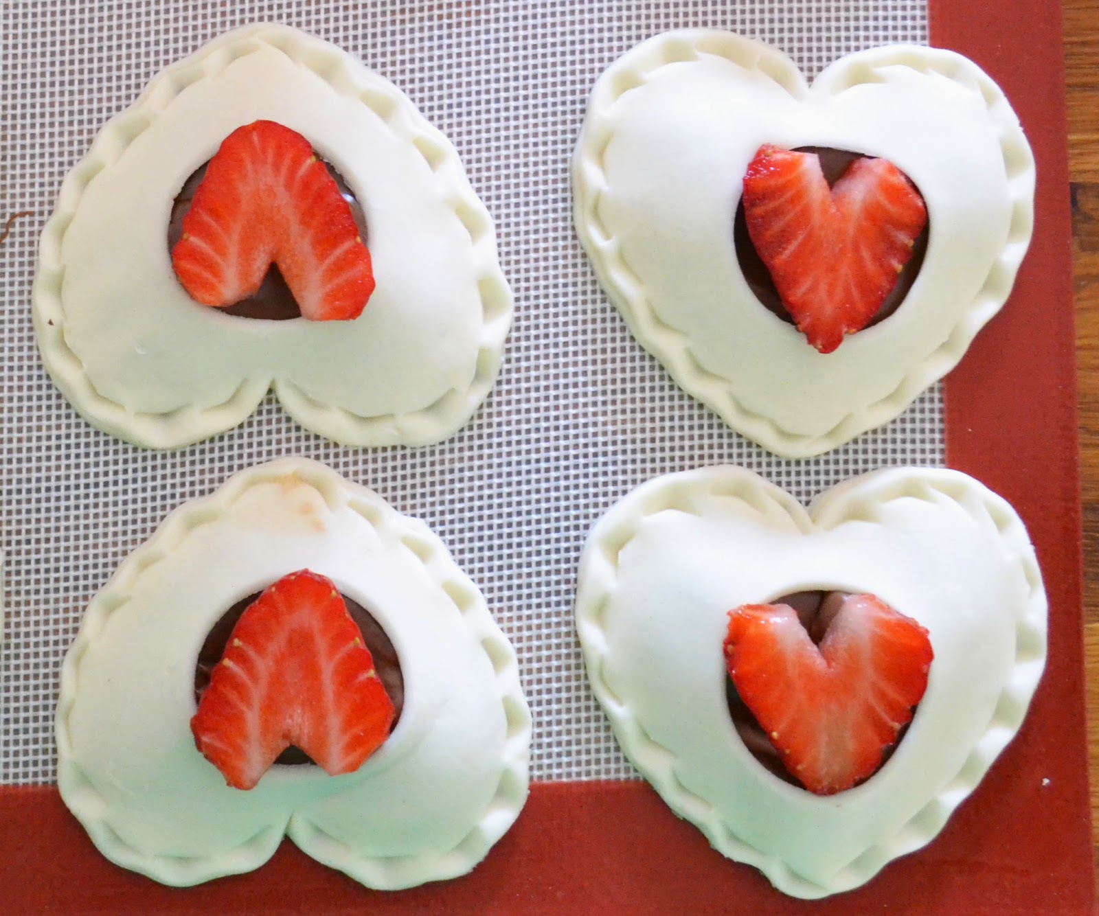 5- Posau aquestes formes sobre les altres, a manera de tapadora. Col·locau un tros de maduixa dins del forat. Jo he laminat les maduixes i les he tallat formant  un cor.