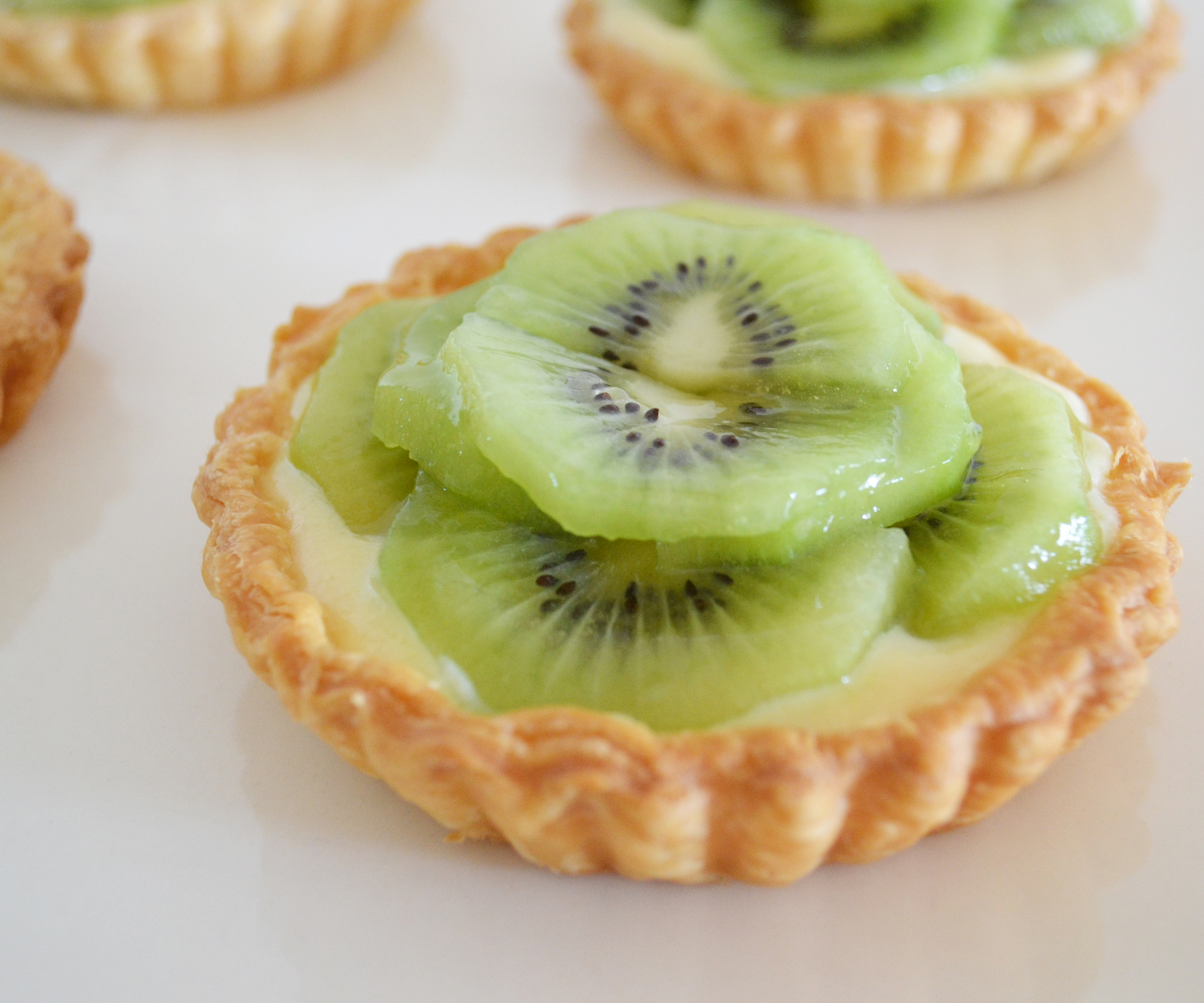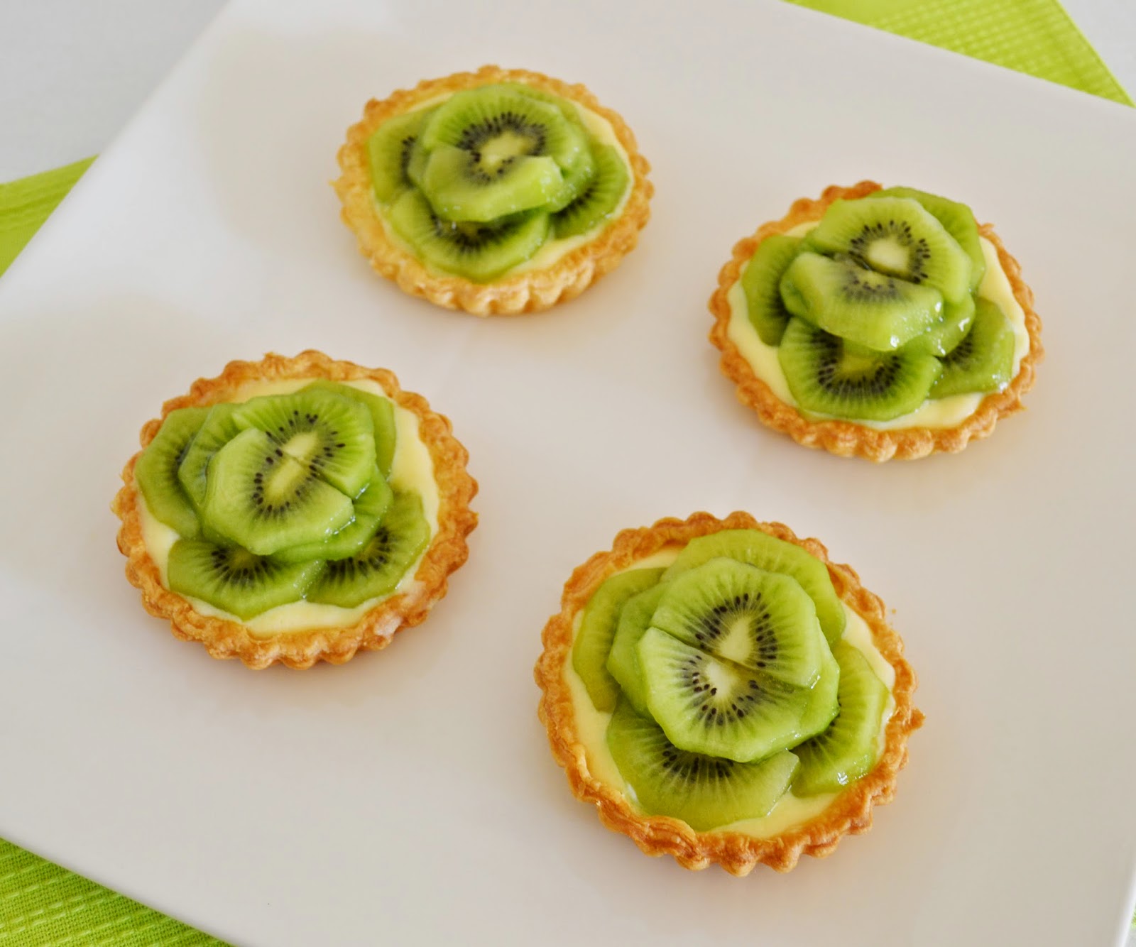Ompliu cada pastisset de pasta de fulls amb unes quantes cullerades de crema i col·locau a sobre les rodanxes de kiwi. Per a què vos quedi brillant podeu pintar per sobre del kiwi amb confitura d’albercoc.